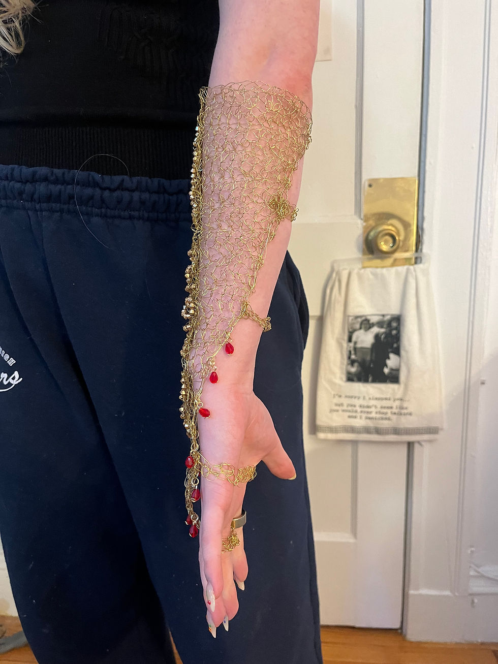 The final piece of this collection is a crochet wire arm plate, inspired by chainmail armor but created using the "feminine" technique of crochet. Using a 5mm crochet hook and soft gold brass wire, Adrianna crocheted the wire into an arm plate that wraps around the base of the forearm and connects around the palm and middle finger. It could be used as a defense technique to shield oneself from an attacker. It features the campaign slogan, "We Fight Back," beaded onto the top of the forearm with gold beads. The arm plate also has red droplet beads to aesthetically connect it to the knife.